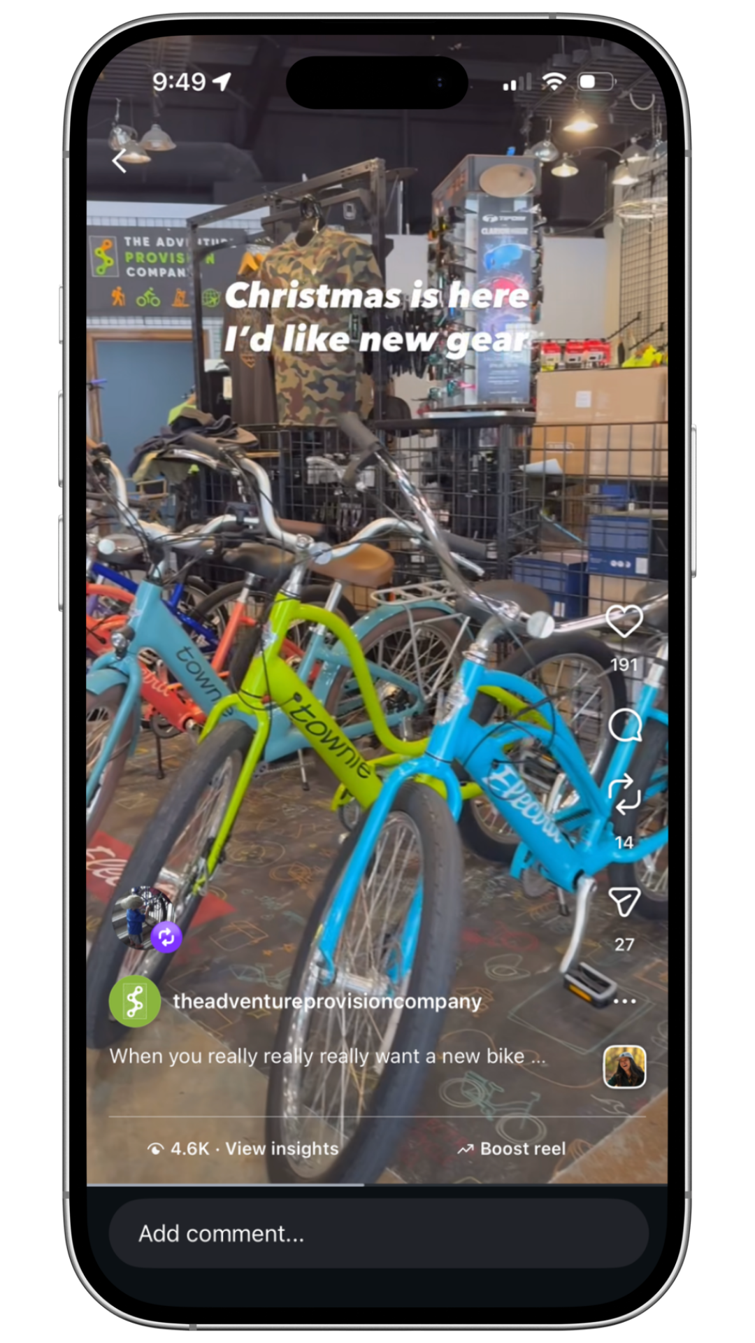 Using niche, non-trending audio, this reel cut through the feed during the holidays, reaching 4.5K views and driving high-intent engagement—191 likes, 27 sends, and 14 reposts.